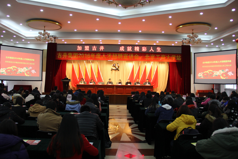 2015年11月18日,公司在阜成路校区召开“古井集团2016年度人才招聘宣讲会”,古井集团党委副书记、古井贡酒股份公司总经理周庆伍等公司领导、十大正规买足球网站党委副书记董竹娟、就业指导中心主任杨林参加宣讲会,会议由公司党委副书记胡燕霞主持。