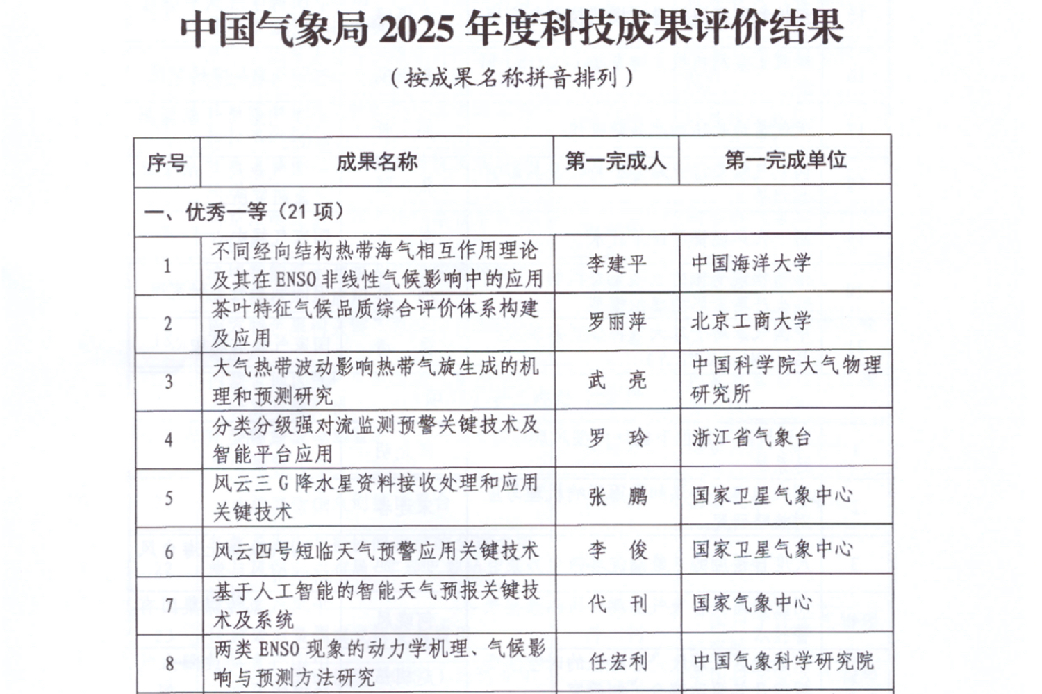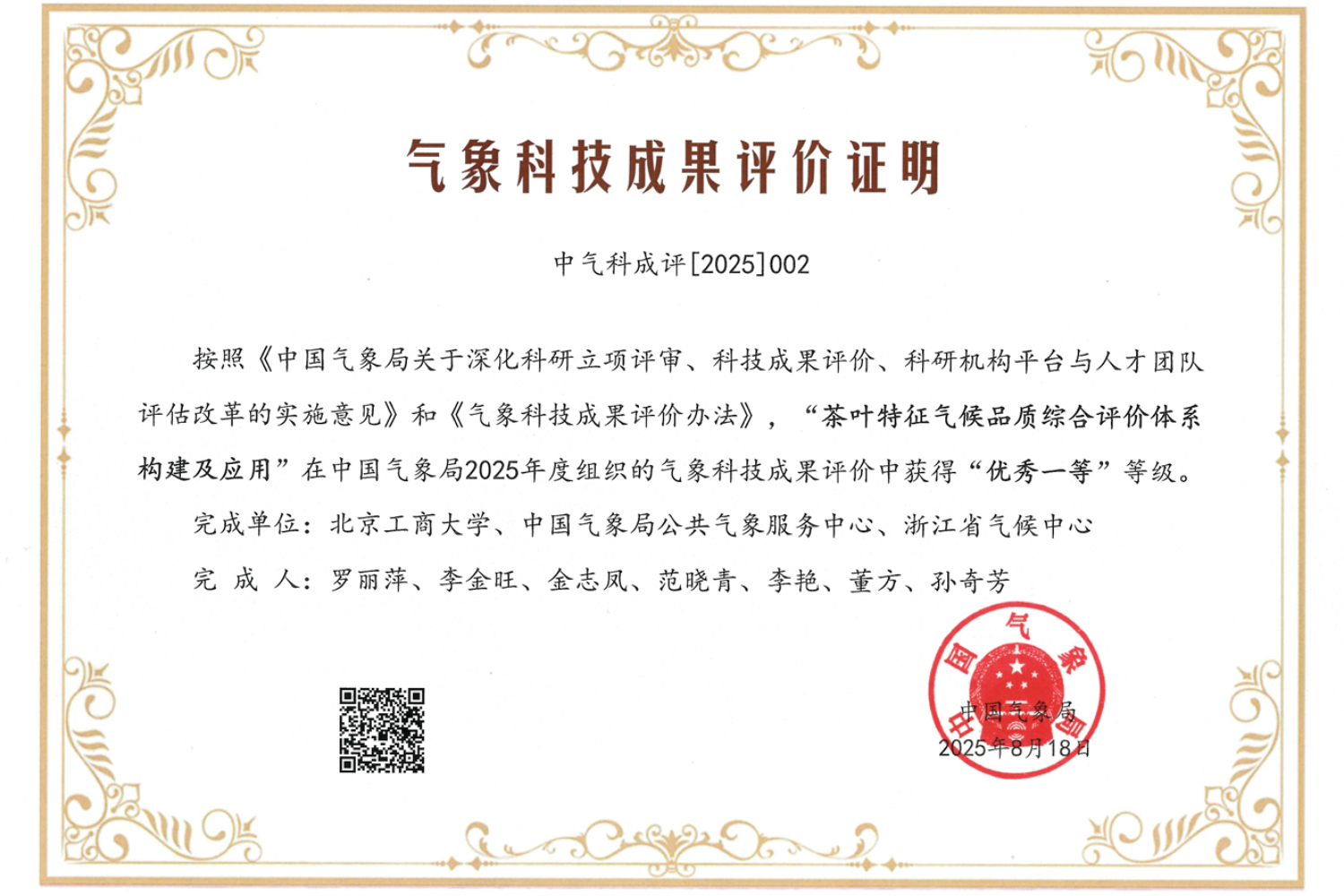 近日,中国气象局公布2025年全国气象科技成果评价结果,由公司十大正规买足球网站罗丽萍教授主持,依托中国气象局与十大正规买足球网站共建农产品气候品质联合研究中心,十大正规买足球网站、中国气象局公共气象服务中心、浙江气候中心共同完成的“茶叶特征气候品质综合评价体系构建及应用”成果,凭借对农产品气候品质研究的创新路径与成果转化国家级业务应用,在众多成果竞争中获评“优秀一等”,实现了公司在该领域的新突破。