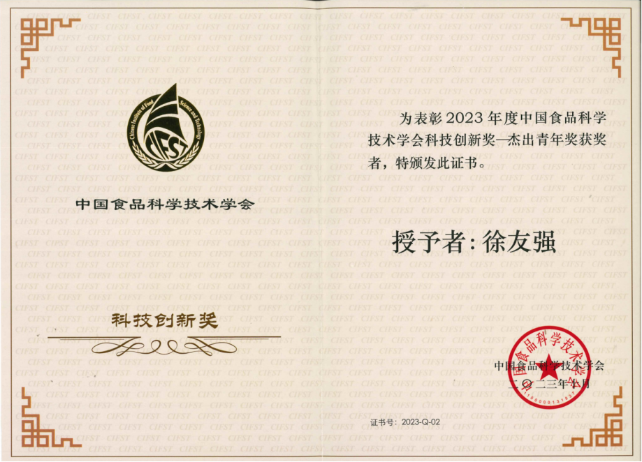 据悉,“中国食品科学技术学会科技创新奖”是由中国食品科学技术学会设立,经科技部和国家科技奖励工作办公室批准设立的社会科技奖励,奖励编号为0150,每两年评审一次,下设突出贡献奖、杰出青年奖、优秀论文奖,其中杰出青年奖授予年龄在45周岁以下,且在食品科技及相关领域科学技术工作中做出显著贡献、取得重大突破和明显社会、生态与经济效益的青年科技工作者或管理者。