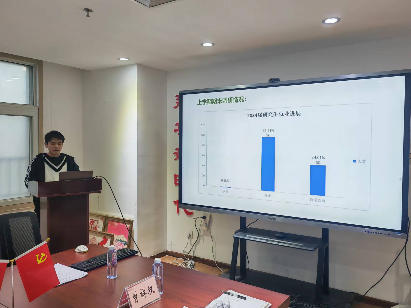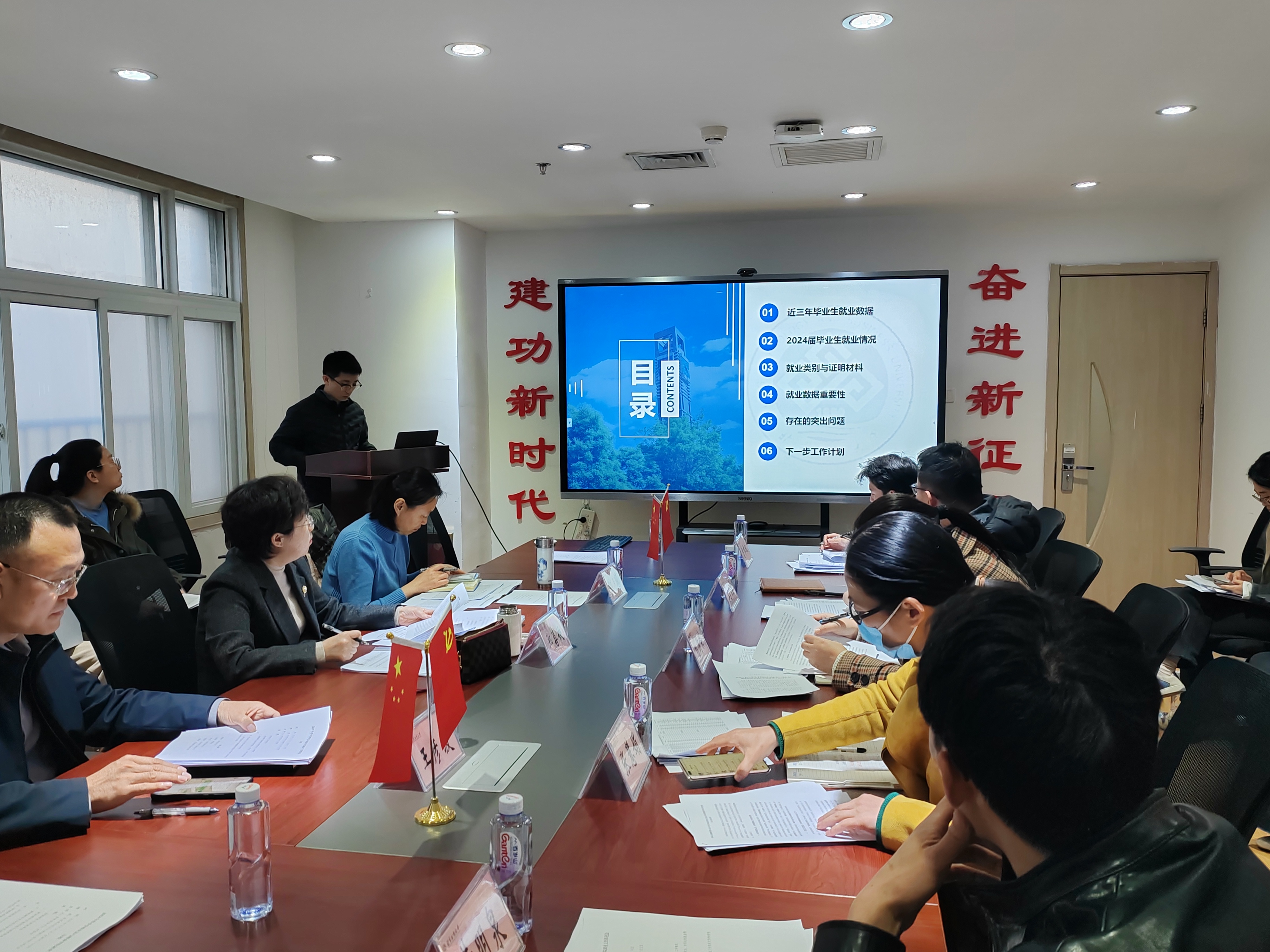 辅导员潘梓逸汇报了2024届毕业生的就业工作整体情况,介绍了公司就业与招生联动机制,着重阐释了就业数据的重要性,指出就业是衡量公司办学水平和人才培养质量的重要指标,动员教师提高认识、广泛参与,共同为员工的就业工作贡献力量。