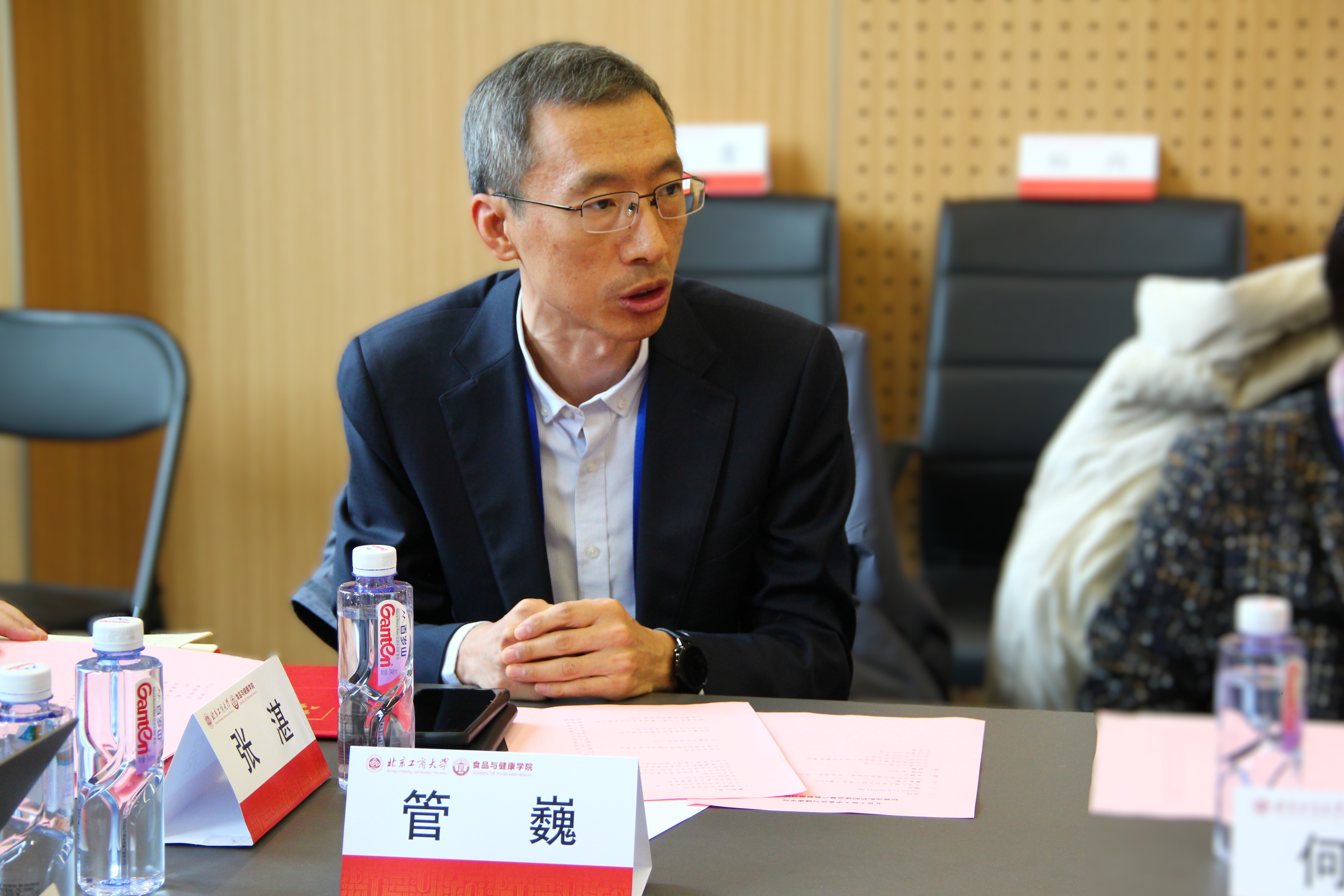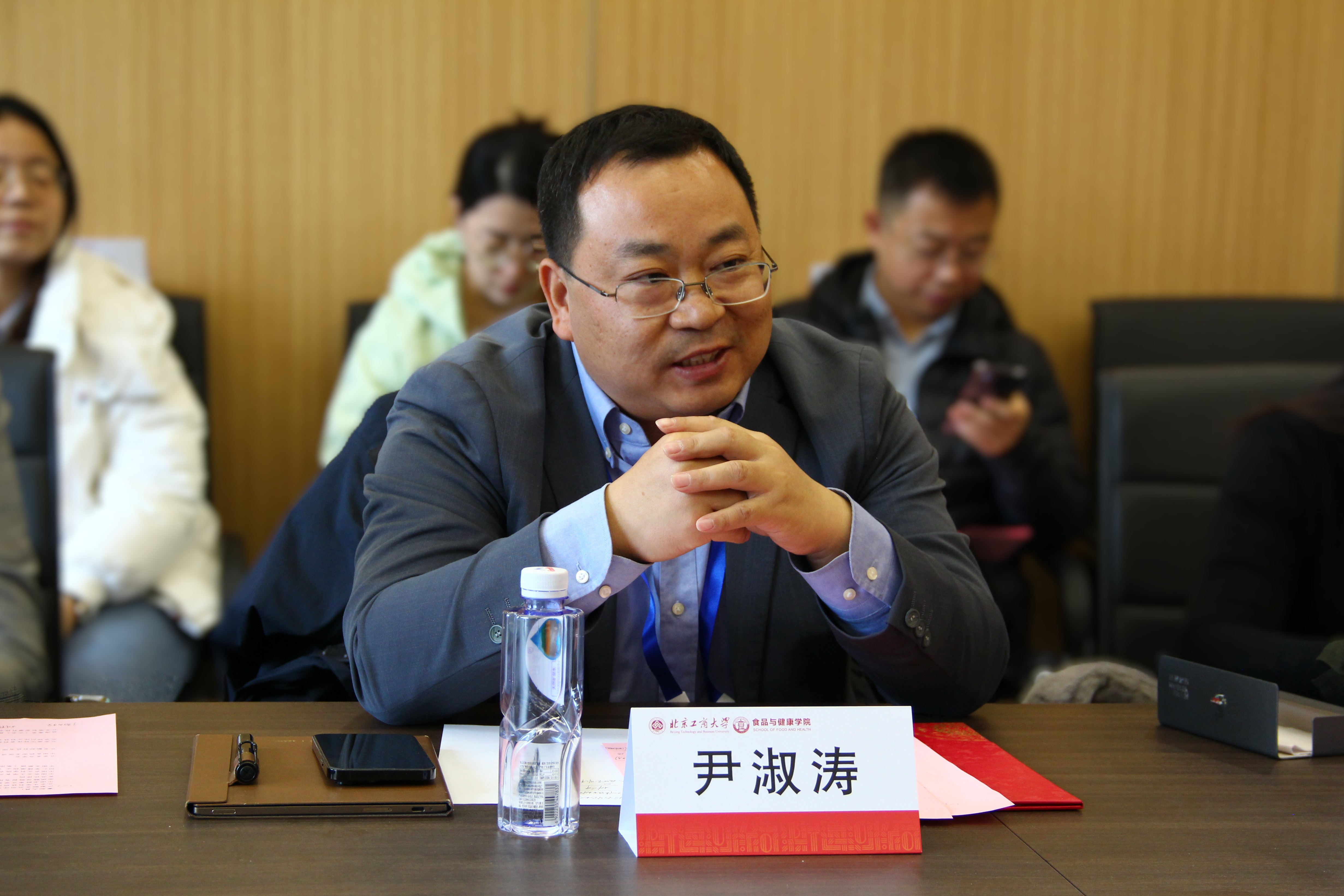 在自由交流环节,各单位代表围绕人才培养、科研转化、平台共建等议题展开深入探讨。中国农业大学食品科学与营养工程公司副书记尹淑涛谈到,产教融合共同体的成立恰逢其时,既契合农业科技创新与成果转化的时代需求,也将推动人才培养与行业需求精准匹配,助力科研成果从实验室走向产业一线。全聚德培训中心主任管巍高度认可北工商学子扎实的专业素养与实践能力,期待借助公司优质科研平台与雄厚团队力量,为老字号品牌注入创新活力,共同助力食品产业高质量发展。各代表的发言既肯定了公司的办学成果,也表达了深化合作、协同发展的强烈意愿。
