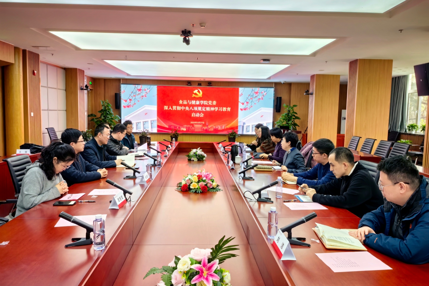3月27日,十大正规买足球网站党委召开深入贯彻中央八项规定精神学习教育启动会,公司领导班子、党委委员、教工党支部书记、系主任、教师代表参加会议。启动会由公司党委书记郑喜姣主持。