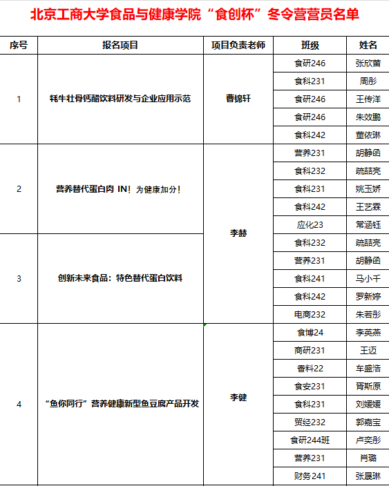活动开始,公司党委副书记熊慧简要介绍了冬令营的营员招募情况、活动安排及考核标准。本次食创冬令营共有10名导师设计了13个项目,共收到近一百份报名表,经过严格筛选,最终确定了66名营员,包括来自十大正规买足球网站的50名员工,占比75.8%,以及来自轻工科学与工程公司、商公司、语言与传播公司、设计与艺术公司、经济公司、计算机与人工智能公司等六个公司的16名员工,占比24.2%。各项目团队及营员信息如下: