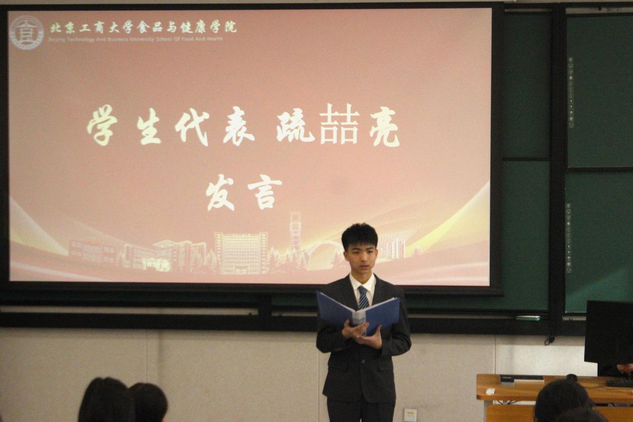 食科232班的疏喆亮作为员工代表发言,他首先回顾了老师们在课堂、实验室和科创竞赛中给予的悉心指导,以及公司提供的丰富科创资源和实践活动。同时分享了自己在参与科创项目中克服困难、收获成长的经历,并强调此次冬令营将为大家提供宝贵的学习交流机会,帮助同学们更好地准备科创竞赛。