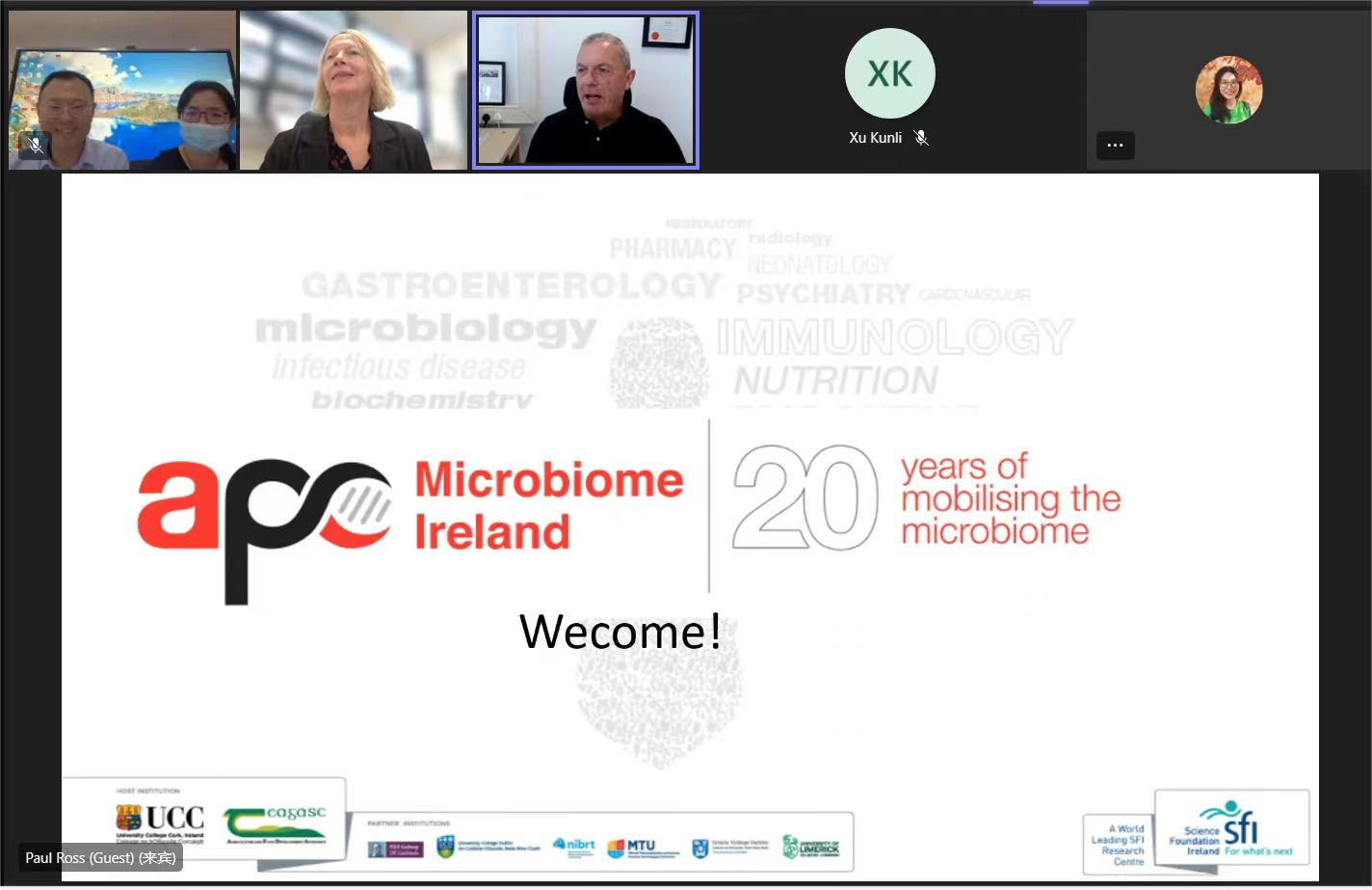 近日爱尔兰国家APC微生物组研究所(APC Microbiome Ireland, 简称APC)、爱尔兰农业部农业与食品发展局(Teagasc)与十大正规买足球网站进行了线上合作交流。此次会议APC负责人、爱尔兰皇家科公司院士、爱尔兰科克大学Paul Ross教授及Teagasc负责人、爱尔兰皇家科公司院士、爱尔兰科克大学Catherine Stanton教授参会,公司经理王彦波教授、副经理王蓓教授以及孟繁宇博士参加了本次合作交流会。